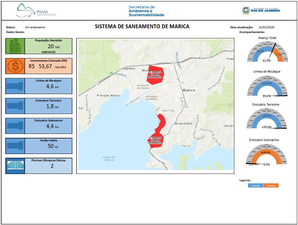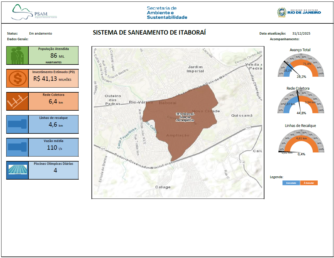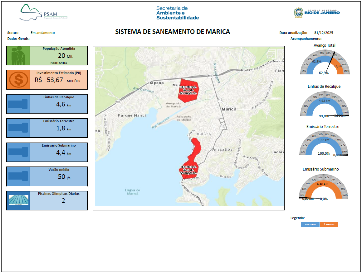 Sistema de Esgotamento Sanitário de Alcântara por separador absoluto que será implantado em parte das Bacias dos Rios Alcântara e Mutondo, no município de São Gonçalo. Essa frente de serviço abrange a complementação de rede coletora que vai conduzir 1.242 litros de esgoto por segundo, de Mutondo para a Estação de Tratamento de Esgoto (ETE) Alcântara. A construção de sete estações elevatórias, que receberão o esgoto da Bacia do Alcântara, além de rede coletora de esgoto com, aproximadamente, 47,3 quilômetros de extensão. O investimento é de R$ 433.836.923,78, do Fecam. As obras irão beneficiar 165 mil habitantes dos bairros de Mutondo e Galo Branco.
