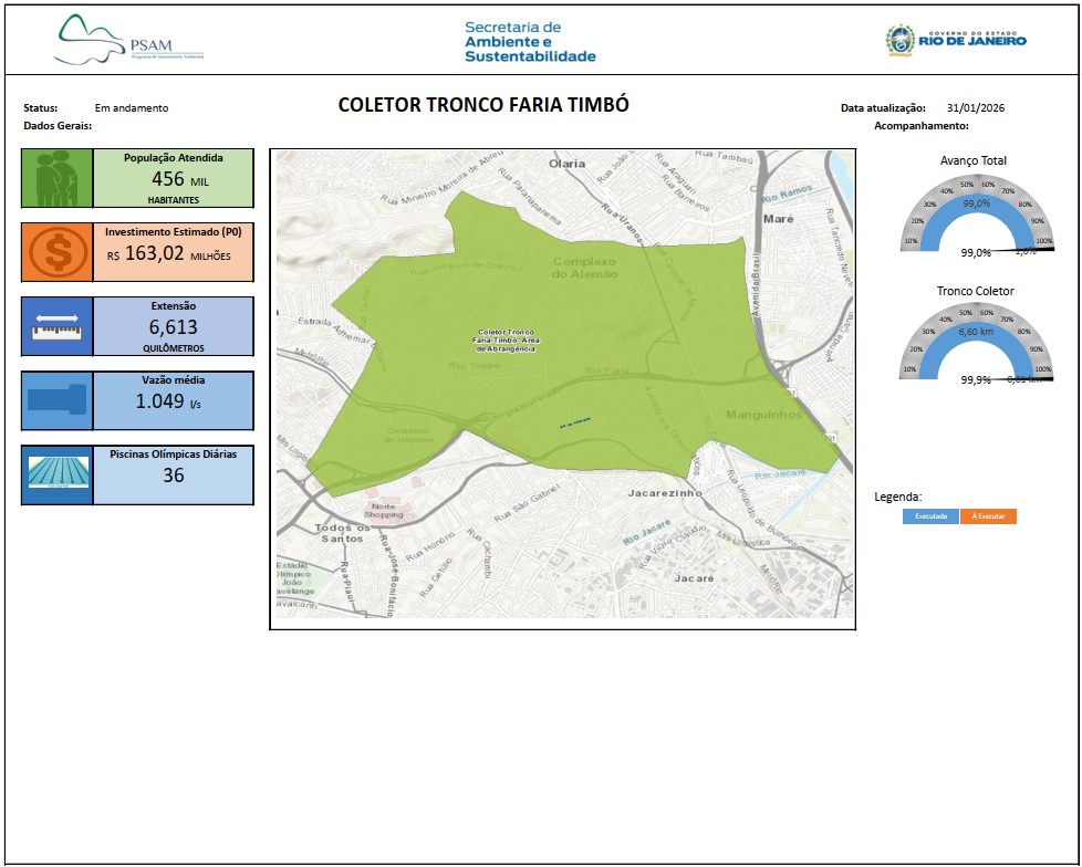 Prevê a instalação de coletor tronco para captação do esgoto sanitário de parte dos bairros de Ramos, Bonsucesso, Olaria, Del Castilho, Inhaúma, Tomás Coelho, Engenho da Rocha, Higienópolis, Engenho Leal, Cavalcanti, Engenho de Dentro, Pilares, Maria da Graça, Encantado, Todos os Santos, Piedade, Cascadura, Madureira, Oswaldo Cruz, Marechal Hermes e Complexo Habitacional do Alemão, beneficiando aproximadamente 456mil habitantes. Reduzirá o lançamento de 1.049 litros por segundo (90,6 milhões de litros por dia) de esgoto na baía de Guanabara, equivalente a 36 piscinas olímpicas.